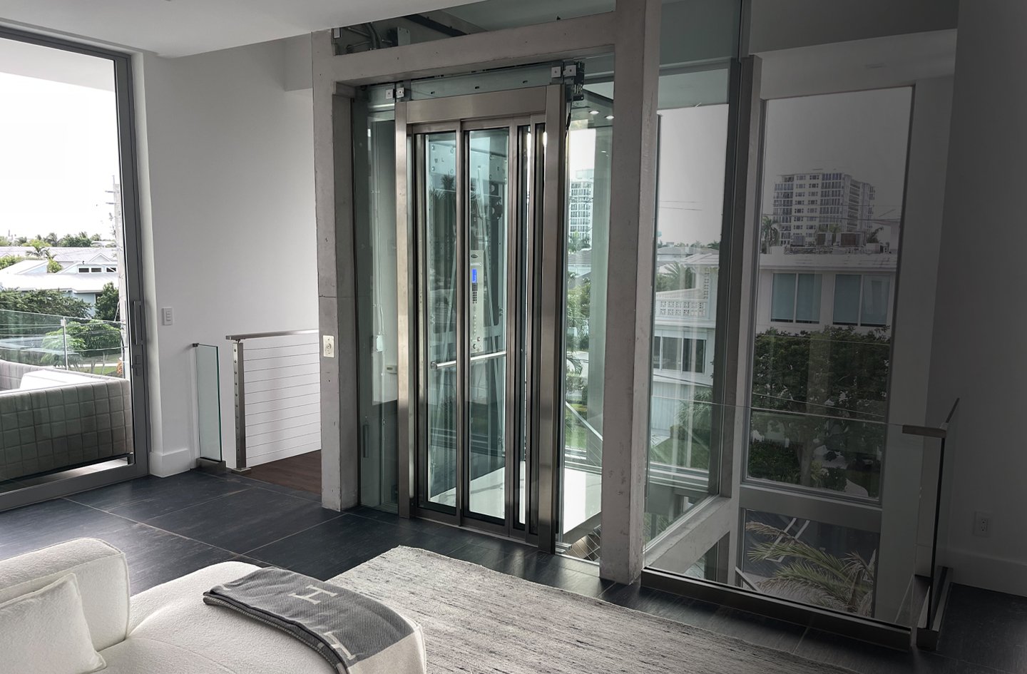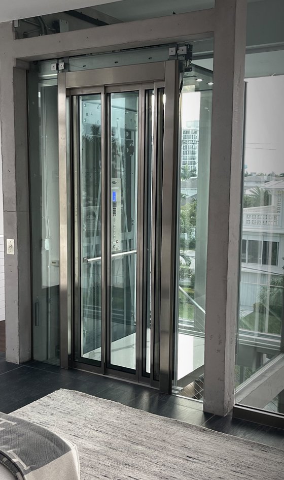 “Every detail of this home is geared for a light, airy, tropical feel—from the huge windows to the floating stairs to the white-and-grey marble floors—and the elevator had to contribute to that sense of almost-weightlessness,” says Kyle Filer, General Manager of Florida Lifts LLC, a division of Savaria USA.