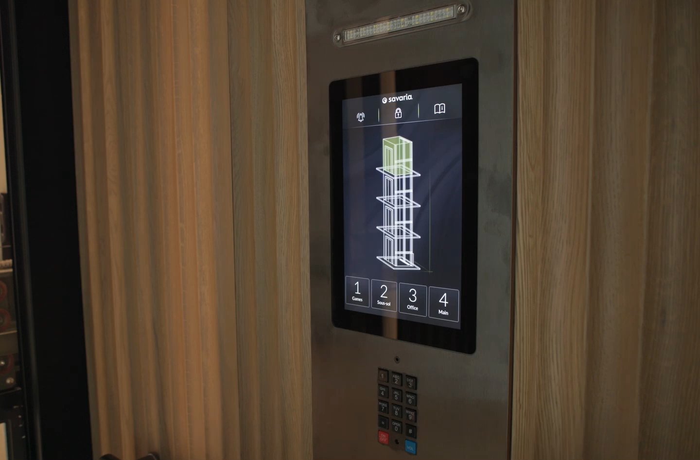 Add the Savaria luxury touchscreen COP (cab operating panel). The large glass screen allows for control of home elevator, while animated themes show the movement as the elevator travels floor-to-floor.
