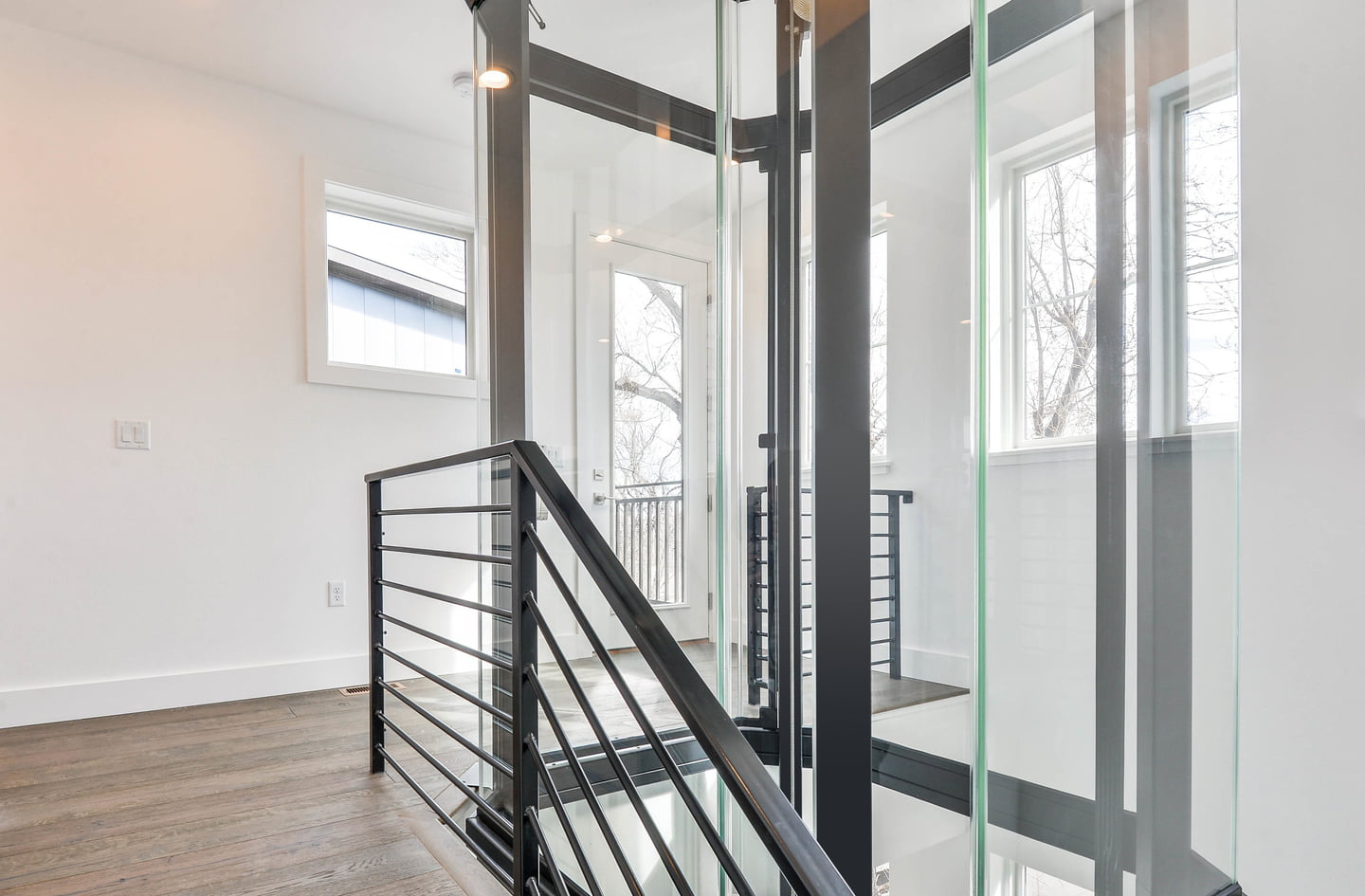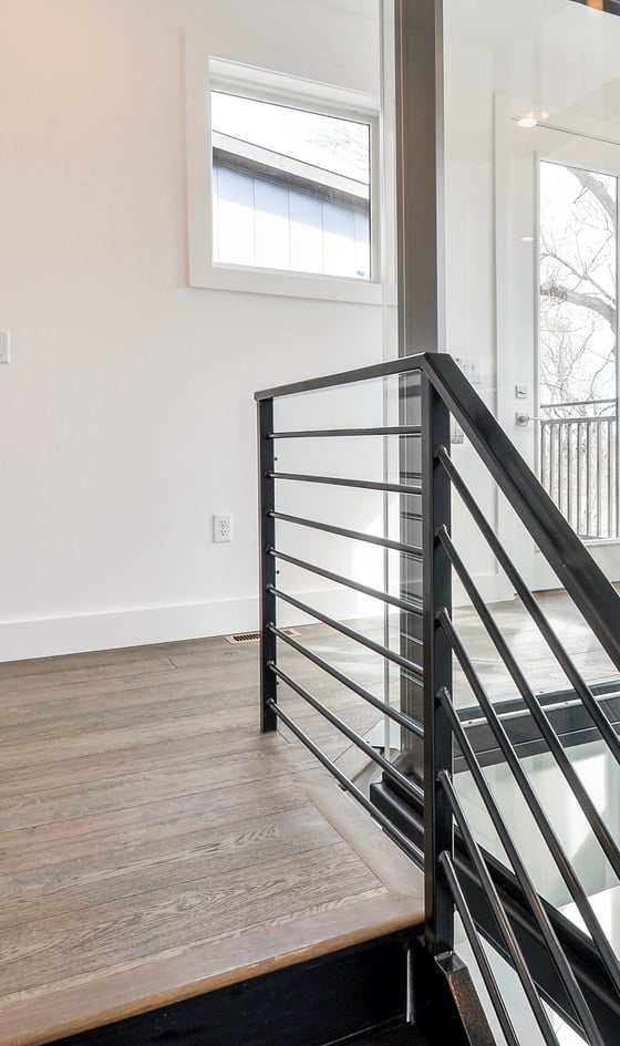Con un ascensore residenziale tradizionale, lo spazio di scorrimento della gabbia avrebbe ostruito la vista. Un ascensore in vetro personalizzato, d’altra parte, avrebbe avuto un costo proibitivo. L’architetto ha scoperto che facendo correre le scale attorno all'ascensore in vetro Vuelift Octagonal+, corrispondente agli standard ADA, avrebbe consentito alla luce di penetrare e allo spazio di restare aperto.
