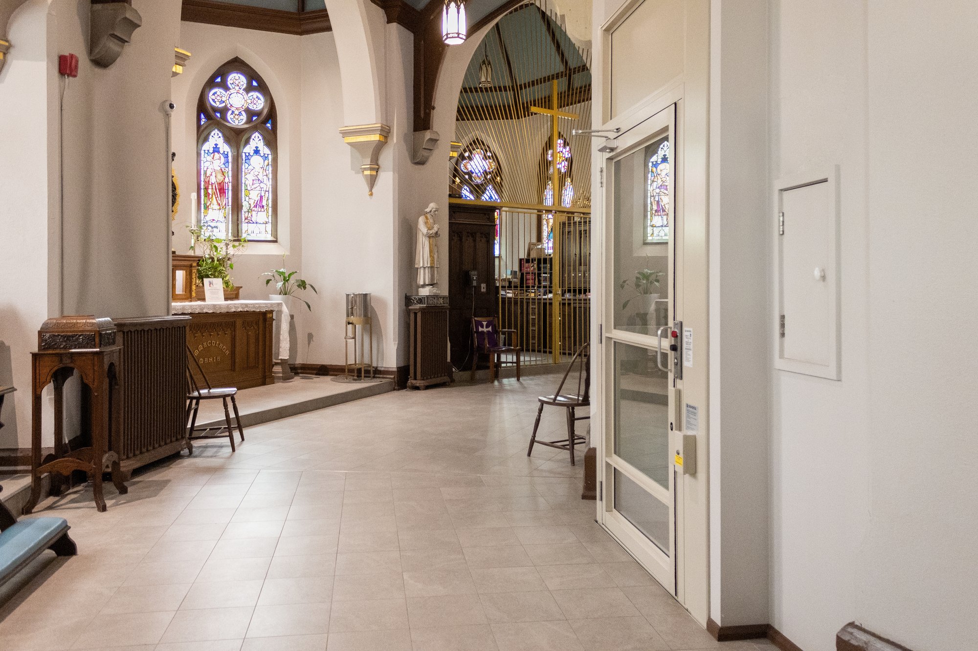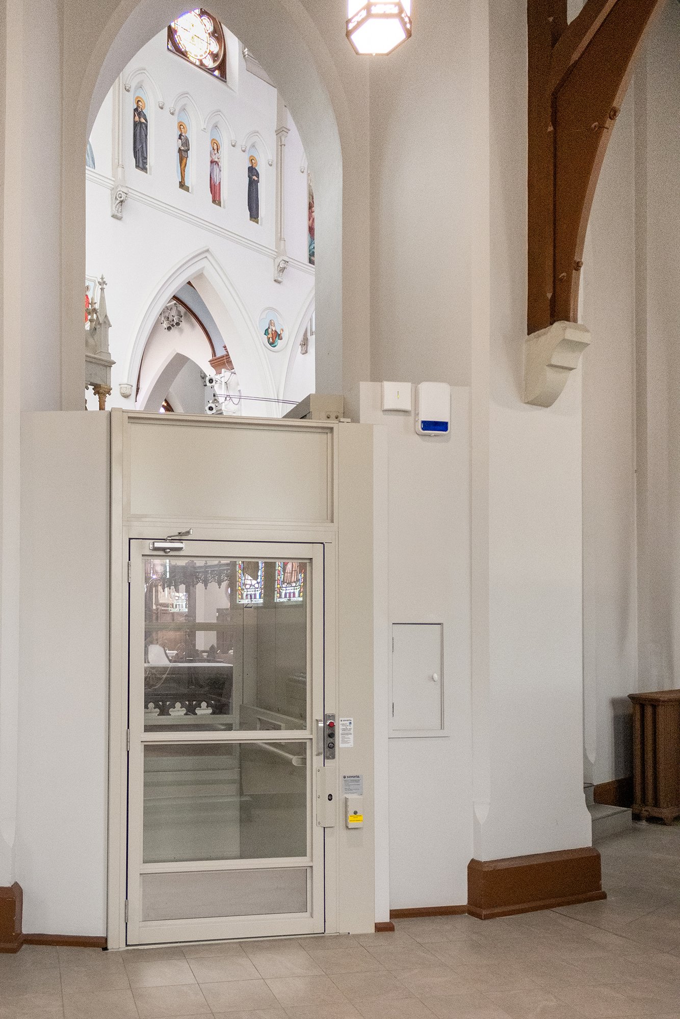 Nestled along the ambulatory of Our Lady of Immaculate Cathedral, the Savaria V-1504 Enclosure Vertical Platform Lift fits seamlessly within the historic interior. The full-height door and gate with glass inserts maintain clear sight lines to the apse, allowing clergy to move efficiently without interrupting the visual or spiritual experience. The lift’s standard almond beige colour harmonizes with the warm tones of the cathedral, creating a subtle, unobtrusive presence. Compact design and smooth operation offer a refined solution for mobility, proving that modern functionality can coexist gracefully with architectural heritage.