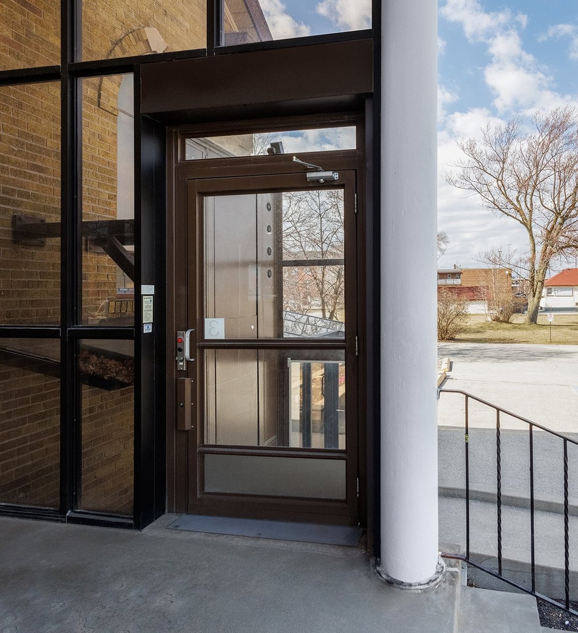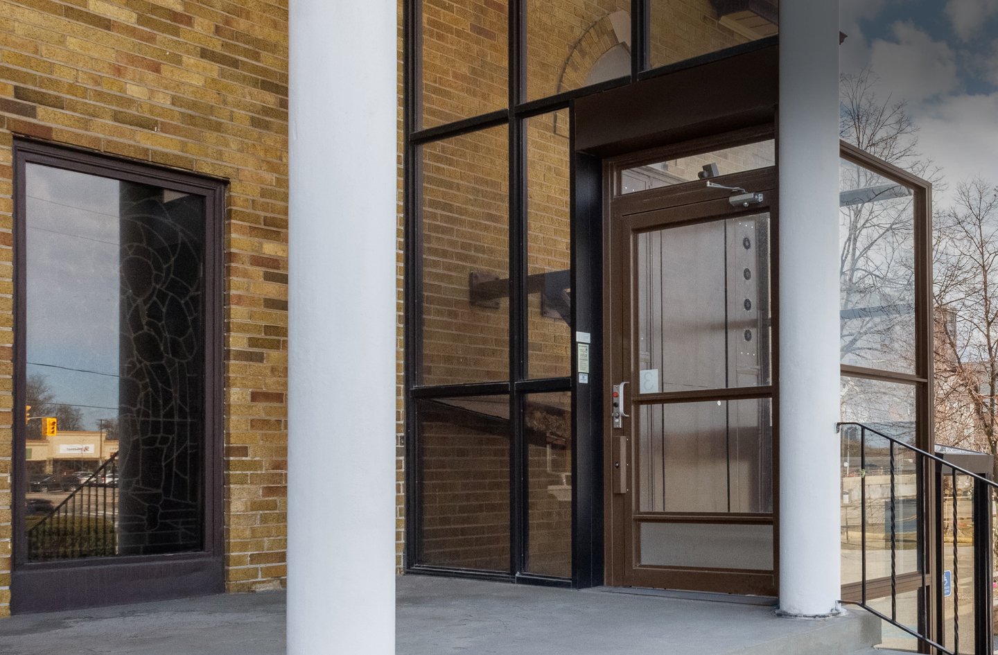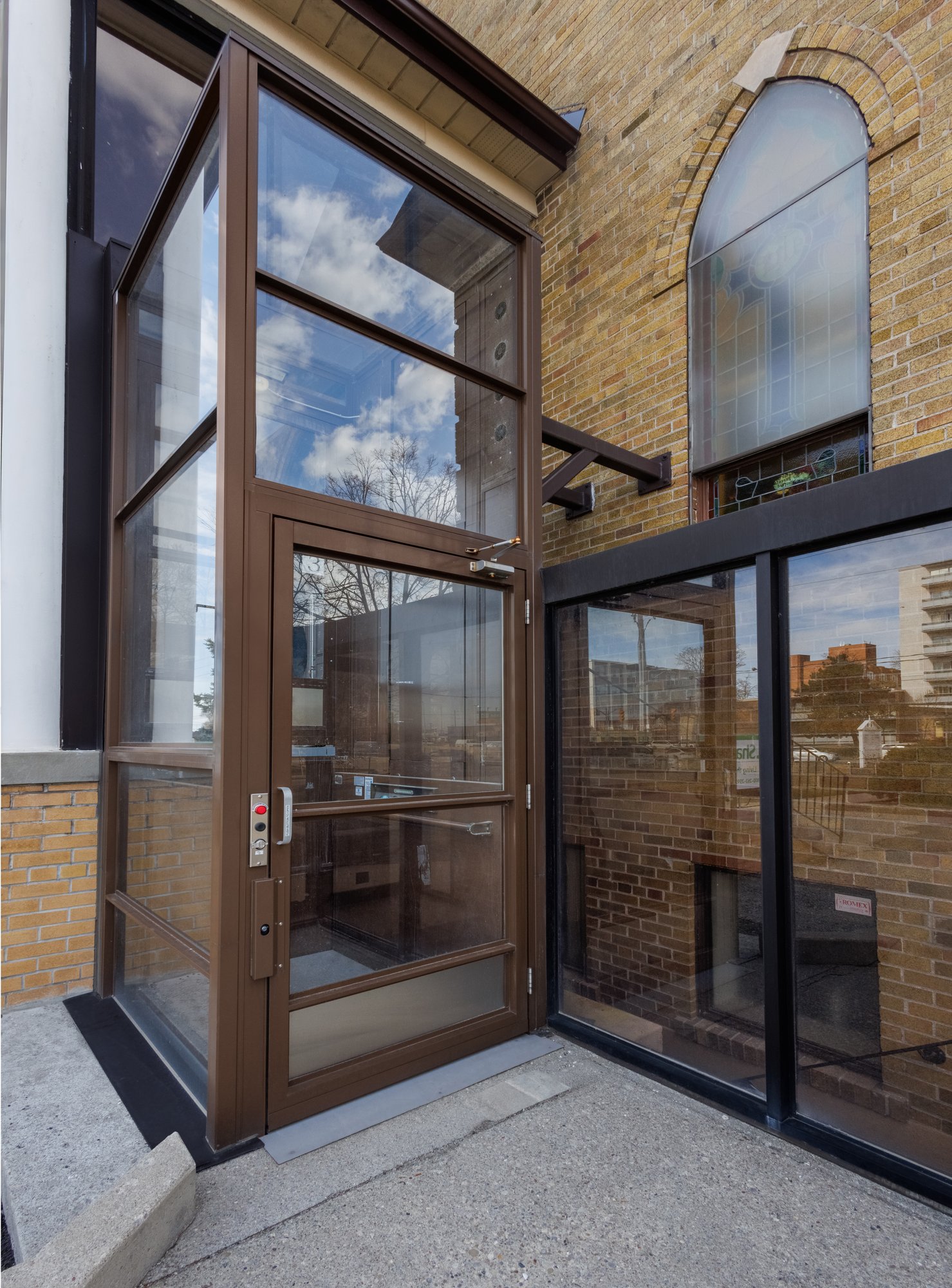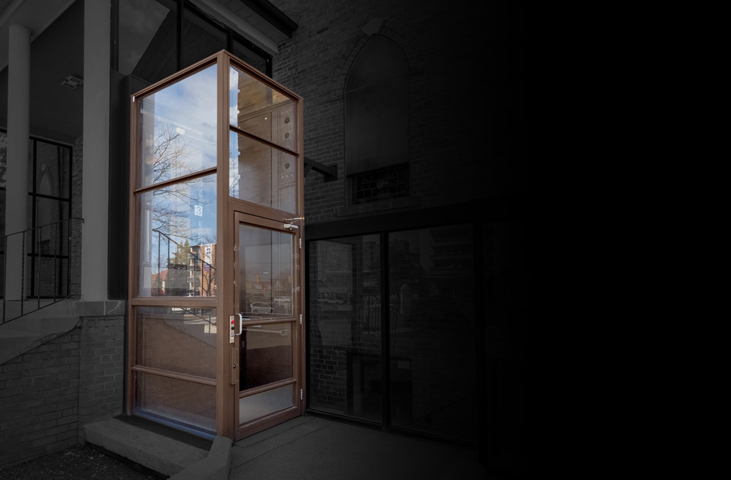 V-1504 Enclosure Vertical Platform Lift provides smooth, dignified access directly from the parking lot. Its dark brown finish with glass enclosure complements the brick façade and brown accents, creating a cohesive and welcoming visual statement. The straight-through access makes it easy for wheelchair uses to navigate. The V-1504 demonstrates that accessibility can be integrated seamlessly without compromising the building’s traditional charm.